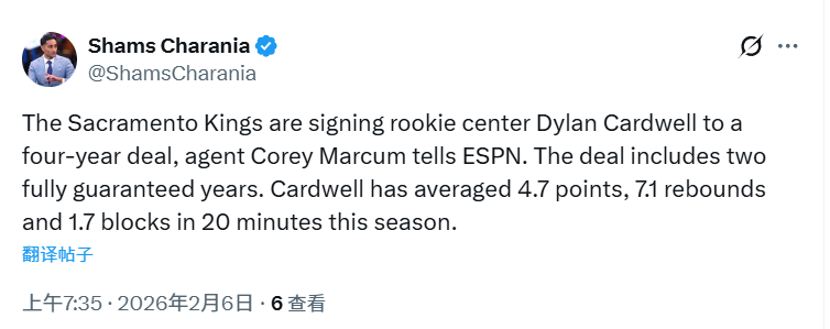北京时间2月6日,据名记Shams报道,球员经纪人Marcum向ESPN透露,萨克拉门托国王与新秀中锋迪伦-卡德威尔达成一份四年合同,其中前两年为全额保障。