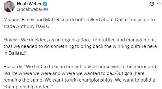 在谈到交易浓眉的决定时,芬利表示:“作为一支球队,从管理层到运营部门,我们一致决定必须有所行动,让达拉斯的赢球文化重回这片赛场。”里卡迪则称:“我们必须坦诚地审视自身,认清球队当下的处境,也明确我们想要抵达的高度。我们的目标始终未变,我们渴望夺得总冠军,也立志打造一套能问鼎总冠军的阵容。”