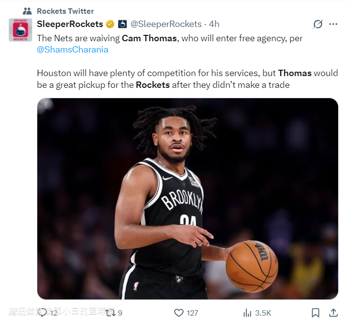 随后休斯顿媒体SR跟踪报道,篮网将裁掉托马斯,他将进入自由球员市场,火箭队在交易截止日没有完成引援,火箭有意在买断市场上签下托马斯,但火箭面临不少球队的竞争。(目前被曝出的还有雄鹿、湖人都有意托马斯)