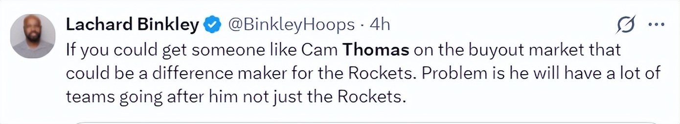 火箭队记兰德里-宾克利透露,如果能有像托马斯这样的球员加入买断市场,那对火箭队来说将会是重大利好。但问题是,会有很多球队争抢他,而不仅仅是火箭队一家。