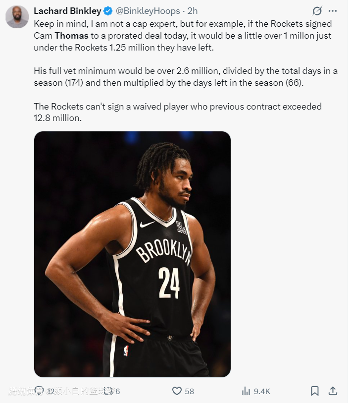 随后他又写道:我并非是一个薪资结构分析师,但如果火箭队真的要签下托马斯,那么他的年薪肯定会超过100万,但目前火箭仅低于第一硬帽125万美元,所以托马斯的薪资最高不超过125万。