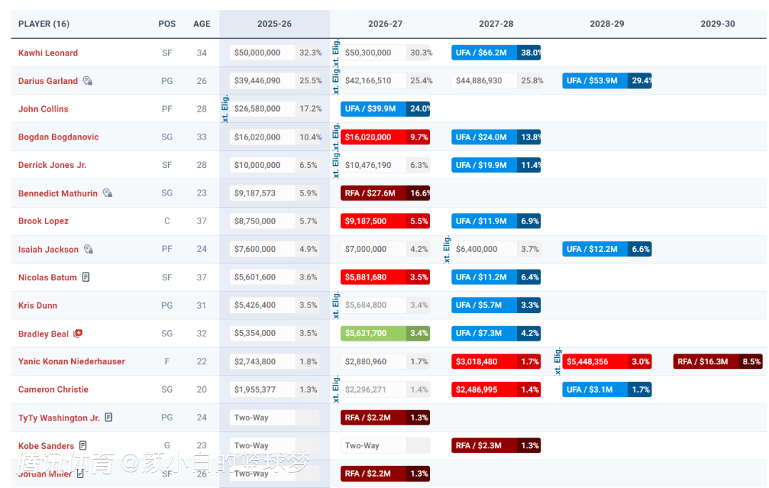 伦纳德、加兰、科林斯、博格丹诺维奇、琼斯、马瑟林、大洛、杰克逊、巴图姆、邓恩、比尔、尼德豪泽、克里斯蒂;泰泰华盛顿、米勒、桑德斯(双向合同)。根据此前的报道,快船进行交易后会转正米勒、桑德斯的双向合同,会跟这两人签下正式的新秀合同。