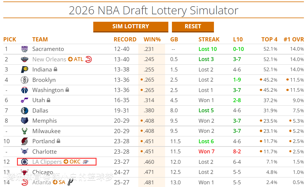 快船2026年的首轮签在雷霆,目前快船这个首轮签预测是12顺位,只要快船的战绩继续下滑这个首轮签就会继续攀升,雷霆这下又躺赢了?