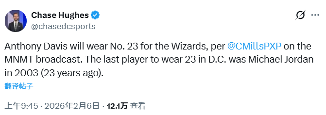 北京时间2月6日,根据MNMT转播台报道,安东尼-戴维斯将身穿23号球衣效力奇才。上一位在奇才身披23号的球员,正是2003年的迈克尔-乔丹——距今已有23年。