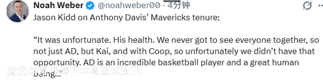 谈到浓眉在独行侠的这段经历,基德表示:“这很遗憾,主要是他的健康问题。我们从来没能让所有人(安东尼-戴维斯、欧文、弗拉格)一起完整出战,所以不只是浓眉,还有欧文和弗拉格,我们没能拥有那样的机会。浓眉是个不可思议的篮球运动员,也是个很棒的人。交易发生后我和他聊过,我们只是谈到要理解这是生意的一部分,并祝福他和他的家人一切都好。这丝毫不影响他仍是世界上最出色的球员之一。”