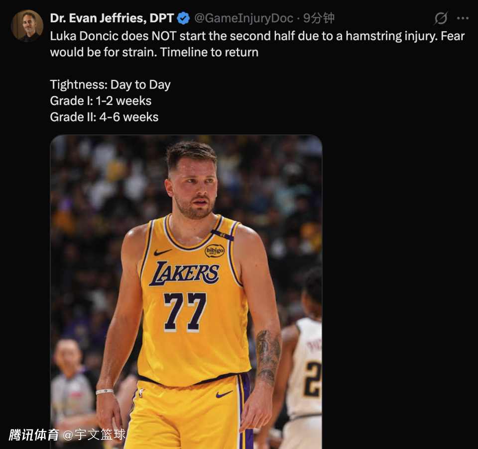 对于东契奇的伤情,医学专家Evan Jeffries进行了相关解析,初步判定为腿筋拉伤。如果东契奇仅仅是出现紧绷感,那么他会进入每日观察阶段。一级拉伤则需要缺席1-2周,最糟糕的情况为二级拉伤,需要伤停4-6周。