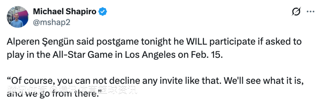 此前NBA全明星分队结果已出炉,世界队9人,字母哥与亚历山大无法出战。这样世界队能打的只有7人,与规定的至少8人出战不符,因此世界队必须再递补一人,谈及自己如果被邀请参加今年全明星的话题,申京表示:“当然,这样的邀请是不能拒绝的。我们看看情况如何,再决定下一步。”