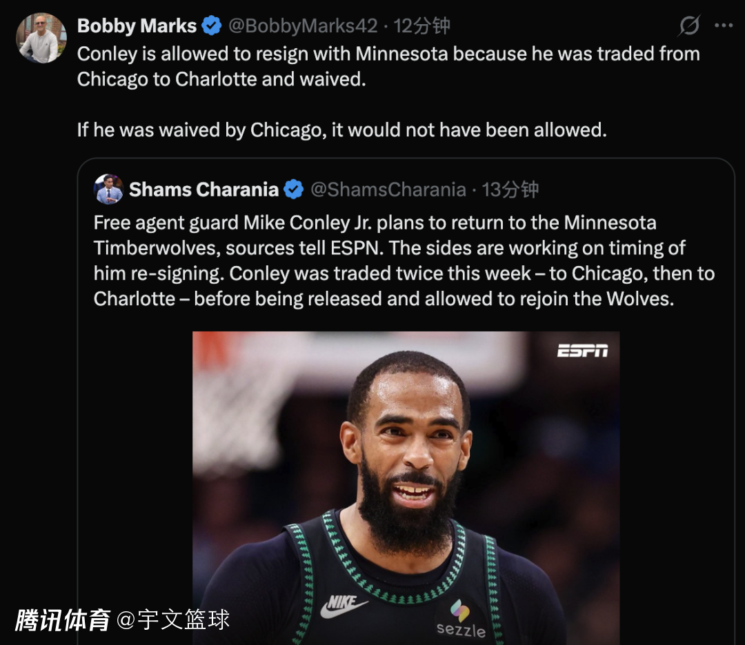 北京时间2月7日,据名记Shams报道,自由球员后卫迈克-康利计划重返森林狼,双方正在商讨续约的具体时间。