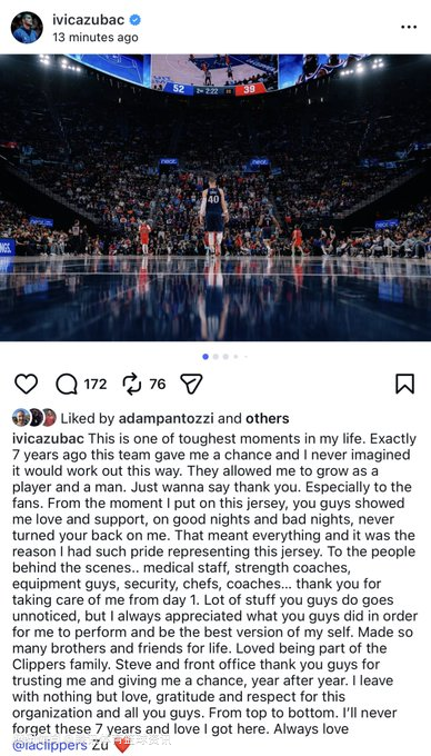 这是我人生中最艰难的时刻之一。整整7年前,这支球队给了我机会,我从未想过会以这样的方式落幕。是快船让我在球员和做人的层面都完成了成长,只想说一声谢谢,尤其要感谢球迷们。从我披上这件球衣的那一刻起,无论赛场顺逆,你们始终给予我爱与支持,从未离弃。这份情谊重于一切,也是我身披快船战袍时,心中满是荣耀的原因。