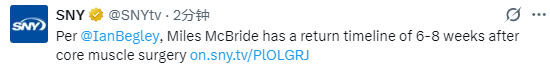 如今,其复出时间有了更明确的说法。据联盟消息人士透露,麦克布莱德术后的康复周期为6至8周。