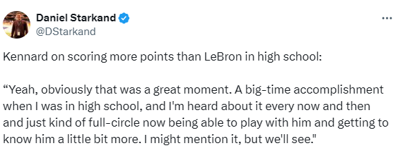 谈及高中时期得分比詹姆斯更多的往事,肯纳德直言这是段超棒的回忆,也是自己高中生涯的一大成就。他表示:“至今仍会有人偶尔提起这件事,如今能和詹姆斯成为队友、慢慢加深了解,感觉一切都兜了个圈,圆满又奇妙,我或许会找机会跟詹姆斯提提这事,具体看情况而定。”