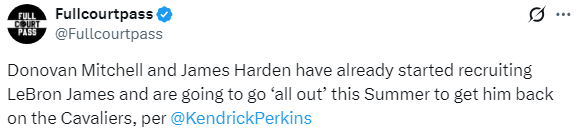 名嘴帕金斯透露,多诺万-米切尔和詹姆斯-哈登已经开始推动在本赛季休赛期招募勒布朗-詹姆斯。消息人士称,詹姆斯-哈登一加入球队或者说与球队联系后,他们的初步计划就是全力以赴争取招募勒布朗-詹姆斯重返骑士。
