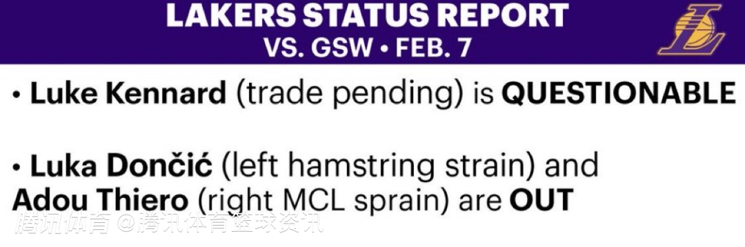 北京时间2月7日,NBA常规赛继续进行,湖人明日对阵勇士。赛前,湖人方面公布球队本场比赛最新伤情,东契奇确认缺阵,新援肯纳德出战成疑。