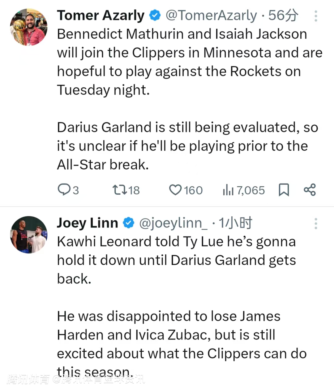 关于这三位新援在快船的球员号码也曝光,加兰选择7号,马瑟林选择9哈,杰克逊选择23号。其中马瑟林和杰克逊将在明尼苏达与快船队会合,他们有望在下周三对阵火箭的比赛中登场。加兰仍在接受伤情评估,目前尚不清楚他能否在全明星赛前复出。