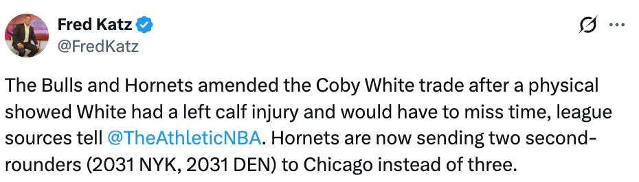 黄蜂队最初同意在这笔交易中向公牛队送出三个次轮选秀权:(掘金或黄蜂2029年选秀权中顺位更靠后的一个、掘金2031年选秀权,以及尼克斯2031年次轮选秀权)。据卡茨报道,黄蜂队将保留那个2029年的选秀权,改为向芝加哥送出两个2031年的次轮选秀权。