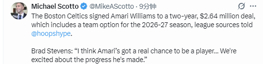 北京时间2月7日,根据NBA记者Michael Scotto报道,波士顿凯尔特人队与阿马里-威廉姆斯签下一份为期两年、总价值264万美元的合同,合同中包含2026-27赛季的球队选项。