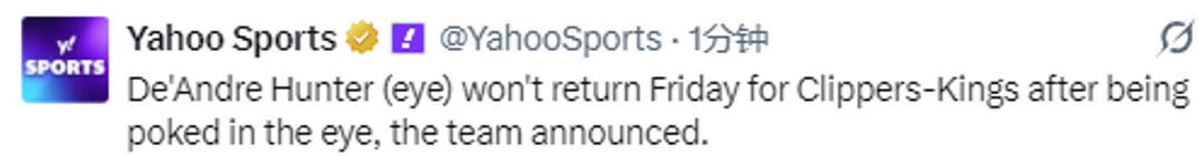 北京时间2月7日,NBA常规赛继续进行,国王队对阵快船队。本场比赛进行到第三节,国王队球员亨特在防守时左眼睛被对手打中流血,随后国王队官方宣布,亨特将退出本场比赛的剩余比赛。
