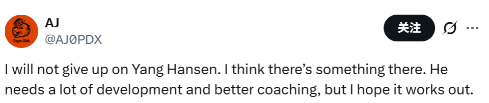 球迷AJ发文写道:“我绝不会放弃对杨瀚森的期待。我相信他身上是有潜力的。他确实需要大量的打磨提升,也需要更优质的指导,但我真心希望他能越来越好。”