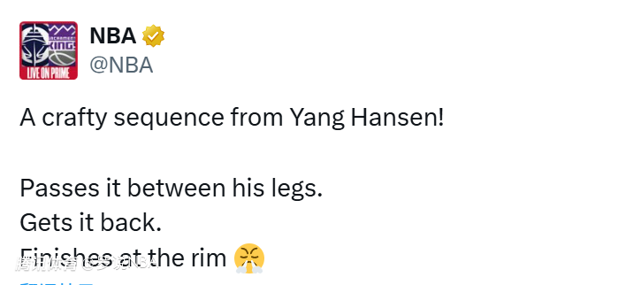 杨瀚森一记胯下传球,给到了韦斯利,而韦斯利突破后再分给杨瀚森,由瀚森把球打进。一整套配合下来,行云流水,让全场球迷欢呼。NBA官方账号转发了这一进球,并配文写道:“这个进攻回合,杨瀚森打得太聪明了!胯下传球,接球突进,篮下终结得分!”