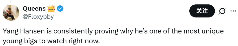 球迷Queens写道:“杨瀚森正持续证明自己为何是当下最值得关注的、风格独特的年轻内线之一。”