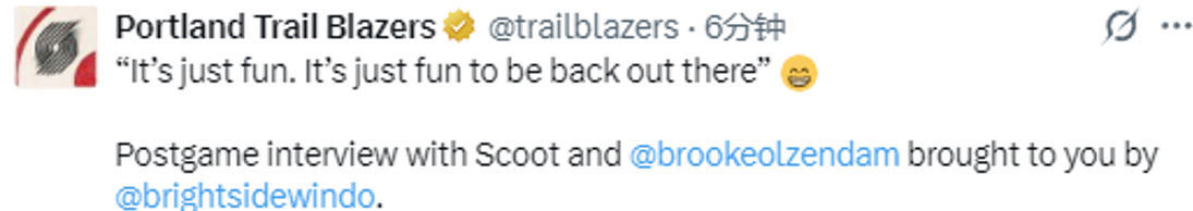 在谈到开拓者球迷的爱意时,亨德森表示:“撕裂之城的各位,我完完全全感受到了这份爱,真的特别感激。这份爱意给了我莫大的动力,让我在赢下比赛的同时,更有了一往无前的劲头。真的,感谢撕裂之城的每一位球迷。”
