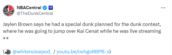 布朗透露,赛前他本信心满满,构思了一套极具创意的扣篮方案,让网红嘉宾Kai Cenat在自己飞跃他完成扣篮时同步开启直播,再搭配联盟的数码地板特效,打造一场视觉盛宴。然而事与愿违,联盟临时叫停了直播计划,打乱了他的全部部署。“训练时我明明能完美完成动作,现在看来,应该是有人授意Kai Cenat关掉直播。” 布朗无奈表示。