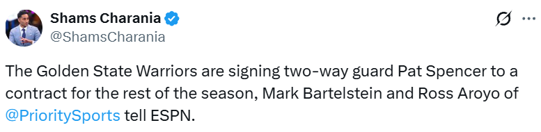 北京时间2月8日,据名记Shams报道,勇士已经正式将帕特-斯宾塞的双向合同转为正式NBA合同,合同期持续到赛季结束。这位身高1米88的控球后卫,现在有资格出战本赛季剩余常规赛,同时也具备季后赛参赛资格——这是他此前双向合同所不具备的。另外,勇士有兴趣签下此前被爵士裁掉的朗佐-鲍尔(球哥)。