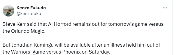 科尔表示,霍福德将继续缺阵明日对阵魔术的比赛,这将是他连续第7场缺阵。而此前因身体不适缺席勇士队对阵太阳一战的库明加,本场将可以出战。