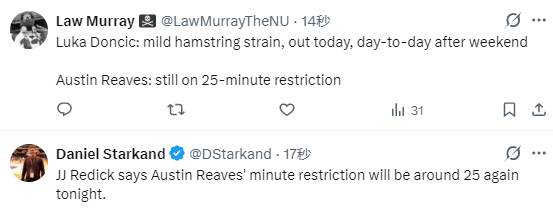 雷迪克表示,东契奇因腿筋轻度拉伤今日将缺席比赛,周末后进入每日观察状态。里夫斯本场将仍然受到25分钟出场时间限制。
