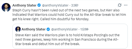 科尔表示,勇士计划让波尔津吉斯缺席接下来三场比赛,全明星假期期间留在旧金山训练,假期结束后再完成勇士首秀。库里尚未确定缺席未来两场比赛,但科尔也透露,勇士可能会让他直接休战到全明星假期,让膝盖彻底恢复。他称库里下一场比赛小概率出战。