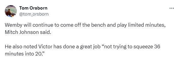 米奇-约翰逊表示,文班亚马将继续以替补身份出战,且出场时间会受到限制。他还特别提到,文班亚马做得非常好,“没有想着要在20分钟里硬塞36分钟的打法”。