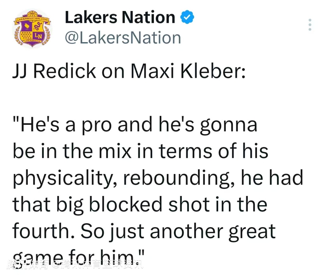 雷迪克谈到克勒贝尔本场比赛的表现:“他非常职业,无论是身体对抗、篮板球,他都能参与进来,第四节还送出了那次关键封盖。所以他今天又是一场出色的表现。”克勒贝尔本场出战28分钟,投篮3中2得到5分7篮板1助攻1盖帽,正负值+12全场最高。
