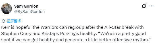 科尔希望勇士能在全明星赛后,在库里和波尔津吉斯都健康的情况下重新振作:“如果我们能保持健康,并且打出更好一点的进攻节奏,我们现在的处境其实相当不错。”