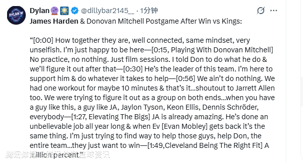 在谈到其他队友时,哈登表示:“艾伦已经非常出色了。他一整年都表现得极其亮眼,等莫布利回归后也会是同样的效果。我只是想尽我所能去帮助这些球员,帮助多诺万,帮助整支球队,他们一心只想赢球。”