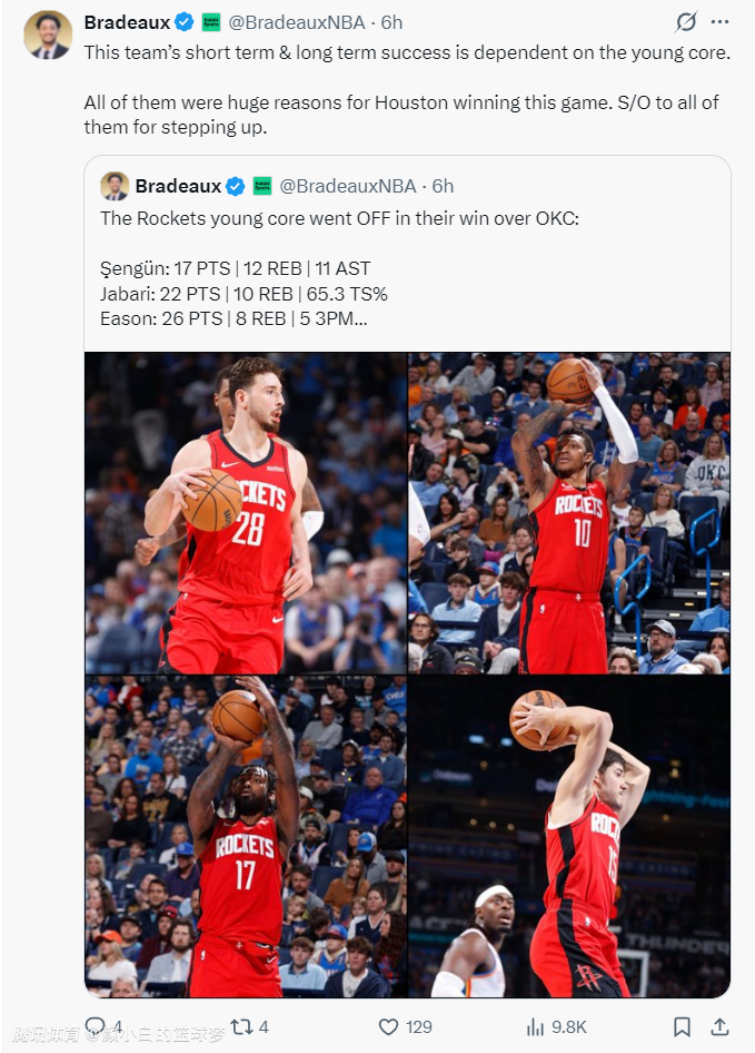 他写道:火箭队的当下的成功与未来的成功都是依靠这支球队中的年轻核心,他们每个人都是休斯顿赢得比赛的重要因素,感谢他们所有人都挺身而出。