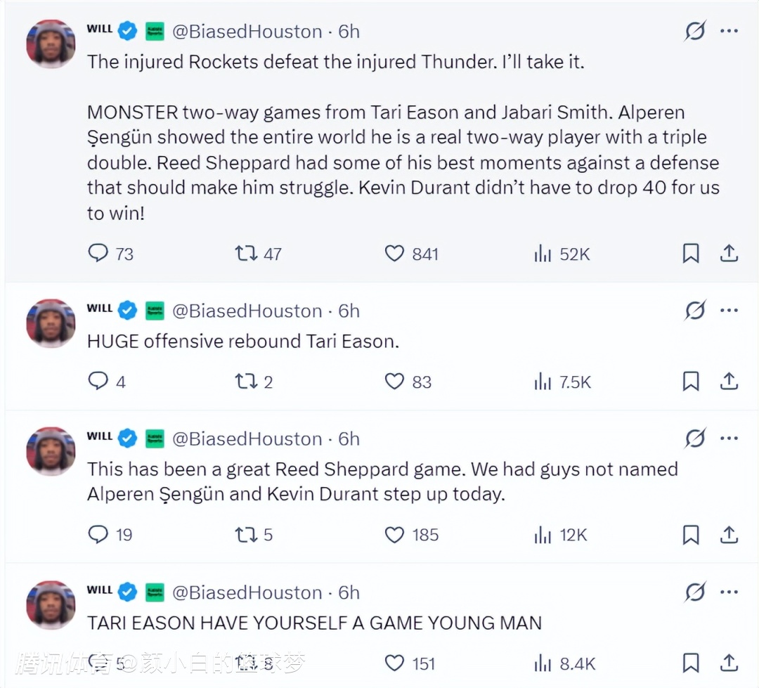 休媒Will写道:残阵火箭击败残阵雷霆我觉得挺好的,伊森与小贾双锋线表现都在线,申京再一次向全世界球迷证明自己是一位全能型的球员拿到三双,谢泼德面对压迫性防守时打出最佳状态。就这样下去,我们不需要杜兰特大包大揽拿40+也能赢球。