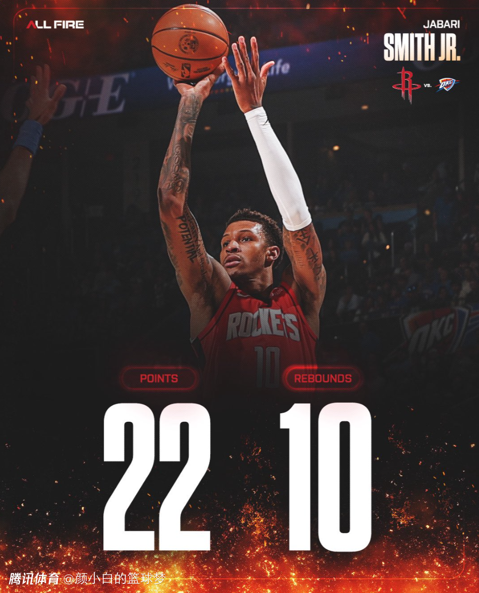 小贾巴里-史密斯是奇兵,鏖战43分14秒,12中5,三分7中3,罚球11中9,拿到22分10篮板1抢断1盖帽0失误,他多次在雷霆内线制造杀伤,当小贾拿到15+后火箭队21胜7负。
