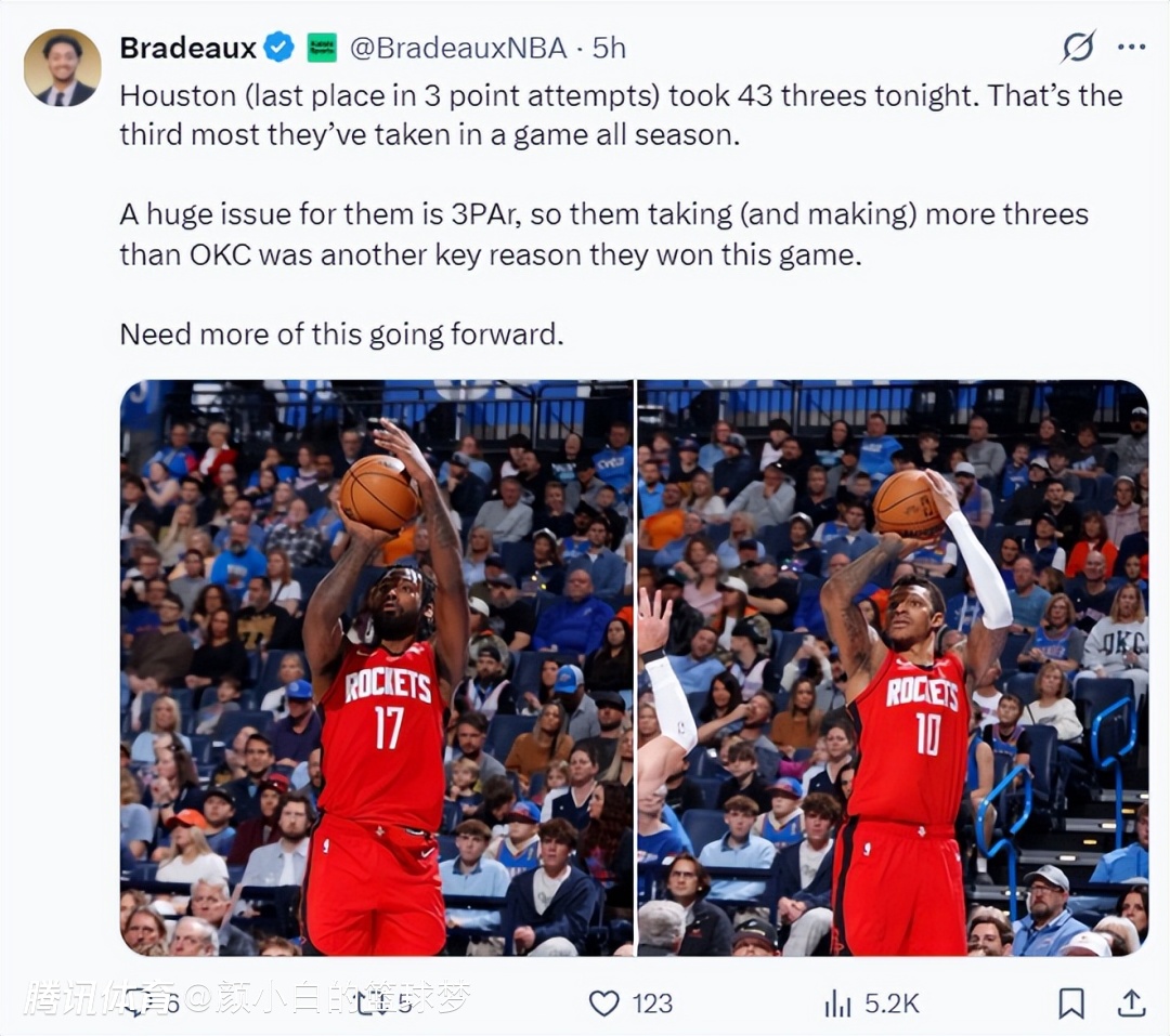 火箭记者Bradeaux写道:火箭队本赛季在三分出手方面是联盟垫底,但此役出手43个三分球,这是火箭本赛季三分出手最多的一场(命中15球)。对于火箭来说三分球出手次数是一个重要的指标,最终他们比雷霆多进1个三分就是赢球关键,未来火箭应该多出手一些外线。