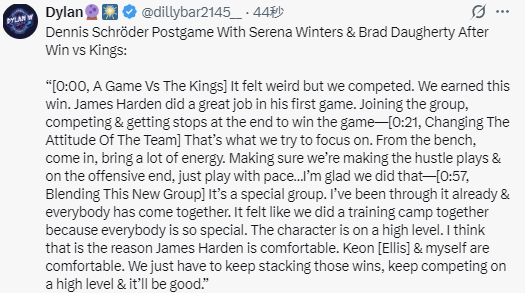 在谈到与国王队交手的感受时,施罗德表示:“感觉有点奇怪,但我们拼到了最后。这场胜利是我们应得的。詹姆斯-哈登首秀表现非常出色,融入球队、全力竞争,并且在比赛末段成功守住关键回合,帮助球队拿下胜利。”