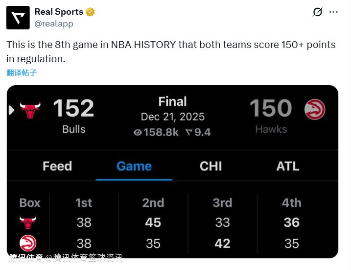 根据数据统计显示,这是NBA历史上第八场双方在没有加时的情况下得分均超过150分的比赛。与此同时,双方阵中合计14人本场比赛得分上双,其中公牛9人,老鹰5人。