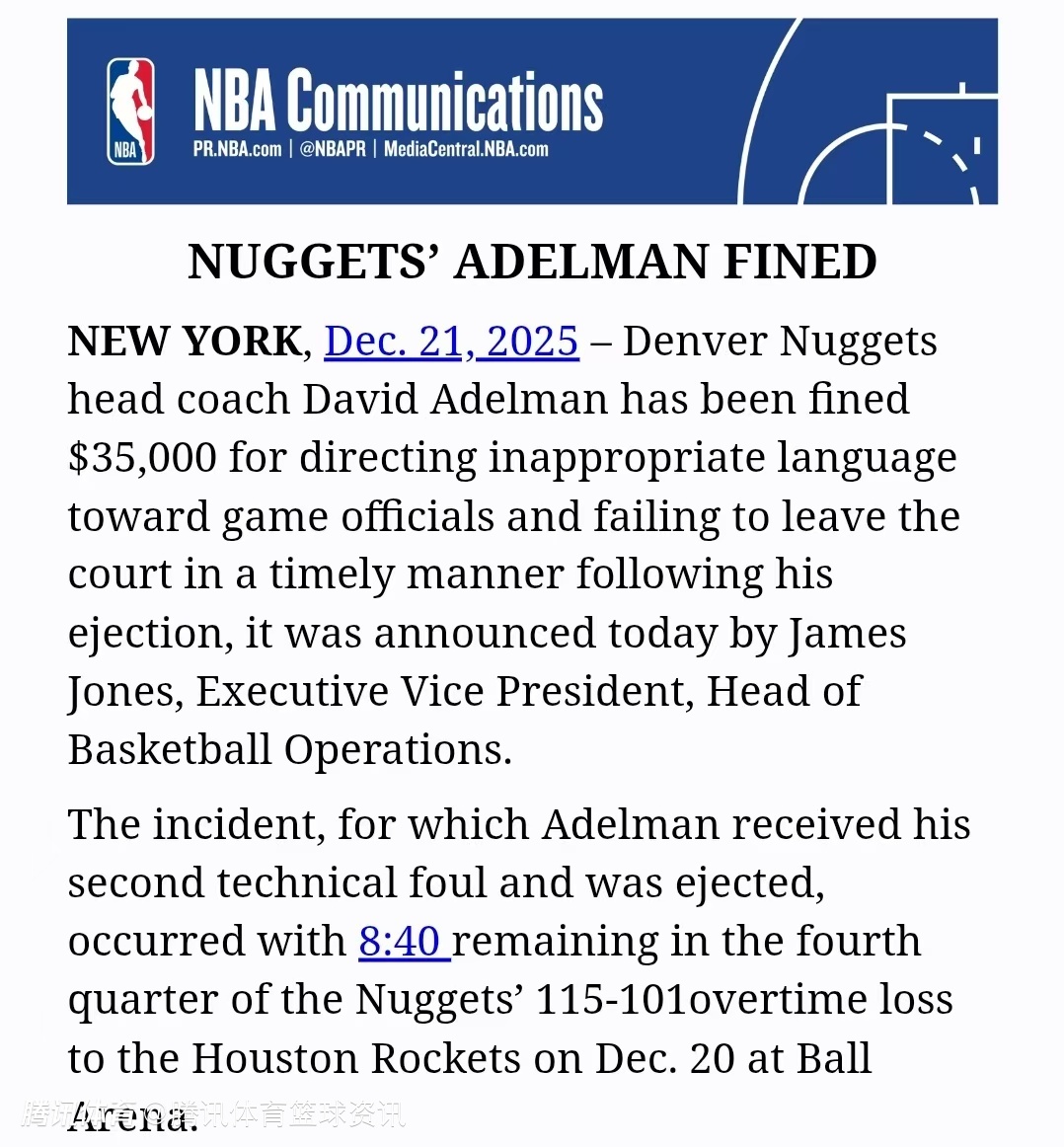 NBA篮球运营总裁兼执行副总裁詹姆斯-琼斯今日宣布,掘金队主教练大卫-阿德尔曼被罚款35000美元,事由为其在被驱逐出场后,向裁判使用不当言论且拒绝及时离场。