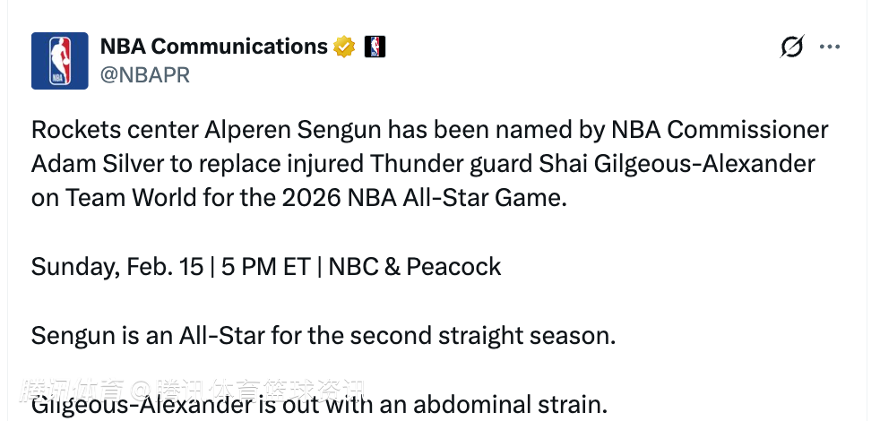 此前,雷霆官方宣布,亚历山大腹部拉伤,将在全明星周末之后进行重新评估。前不久在火箭主场不敌黄蜂的赛后,申京也谈到了关于全明星一事,他表示如果联盟邀请他,他一定会出战:“当然,这样的邀请你无法拒绝。我们会看具体情况,然后再做打算。”