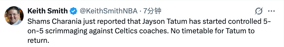 北京时间2月9日,据名记Shams报道,塔图姆在跟腱康复过程中,已经开始参加“受控的5v5对抗训练”,但目前他的回归仍无明确时间表。