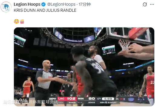 比赛进行至第四节还剩5分钟左右时,森林狼完成一次进攻后,快船球员邓恩在准备底线罚球时突然推搡森林狼球员兰德尔,两人随即爆发冲突纠缠在一起有扭打之势,两队其他球员赶紧上前控制事态升级。