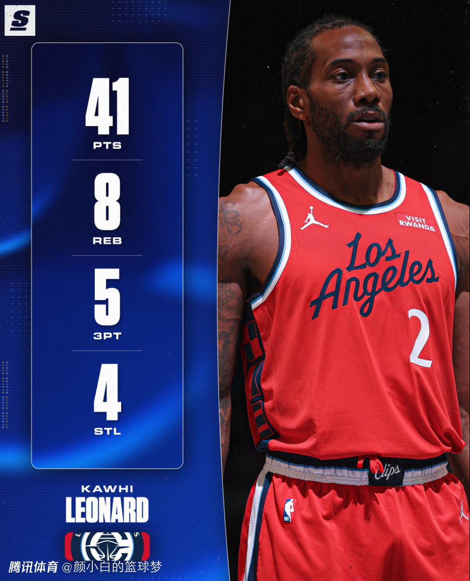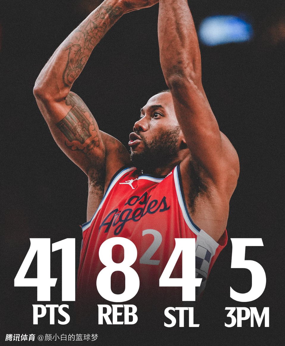 伦纳德这场比赛34分钟,30中14,三分11中5,罚球10中8,拿到41分8篮板2助攻4抢断,命中率46.7%,三分命中率45.5%,真实命中率59.6%,正负值+20。