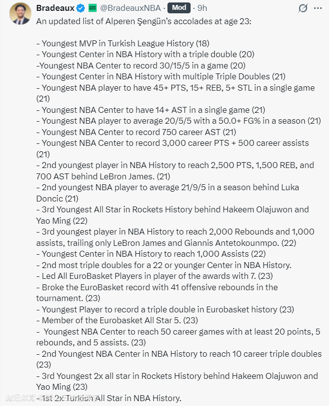 火箭记者Bradeaux晒出23岁的阿尔佩伦-申京所获得的荣誉清单: