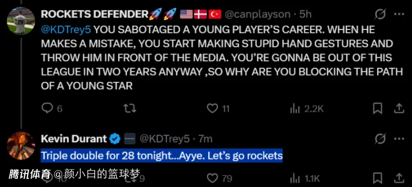对阵黄蜂一战,杜兰特曾炮轰申京该努力防守,这让很多火箭球迷炮轰杜兰特认为KD影响了申京的成长,一位球迷写道:你毁掉了一位年轻球员的职业生涯。他犯错时,你便做出愚蠢的手势,还把他推到媒体面前。反正你两年后就会被联盟淘汰,何必阻碍一位新星的成长之路?