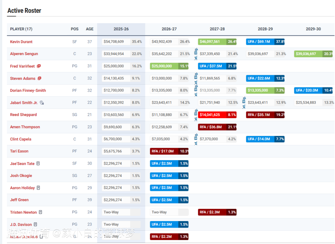 火箭队目前大名单上是14+3,火箭队距离第一硬帽只差125万,这也是火箭竞争托马斯失败的一个要因,可拉塞尔的负面消息太多,除了火箭这种特别欠缺控球后卫的球队才会追求,火箭队最多也只能给125万的底薪。