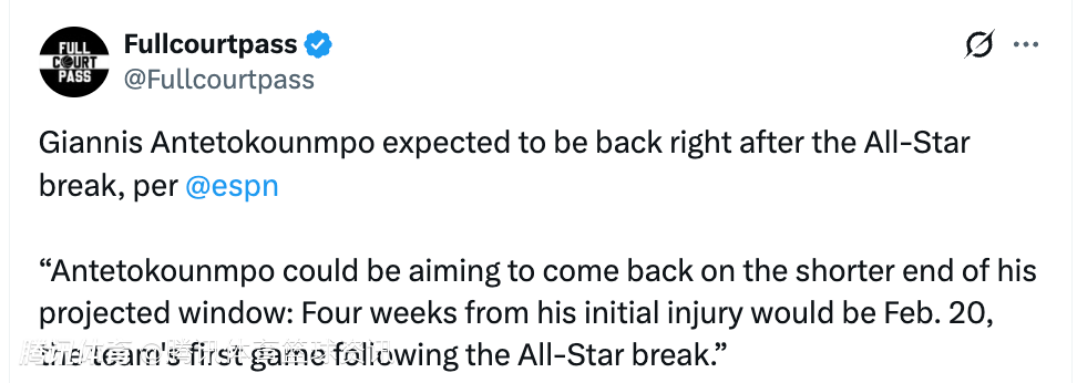 ESPN表示:“字母哥的复出时间可能会比预期窗口的更早,从他最初受伤算起四周,正好是2月20日,也就是球队全明星休赛期后的首场比赛。”