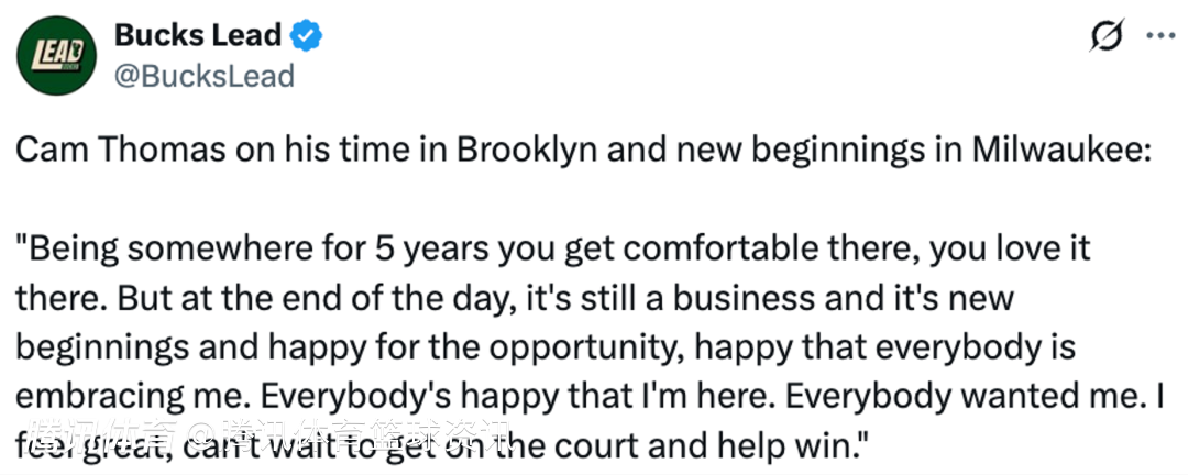 托马斯将在雄鹿身披24号球衣,球队上一位24号球衣主人是帕特-康诺顿。托马斯在接受采访时说道:“在一个地方(布鲁克林)待了五年,你会感到很安心,也会真心热爱这里。但说到底,这终究是一门生意,也是全新的开始。我很感激这次机会,也很开心大家都接纳我。所有人都很高兴我能来,都希望我加入。我感觉棒极了,已经迫不及待想要上场,帮助球队赢球。”